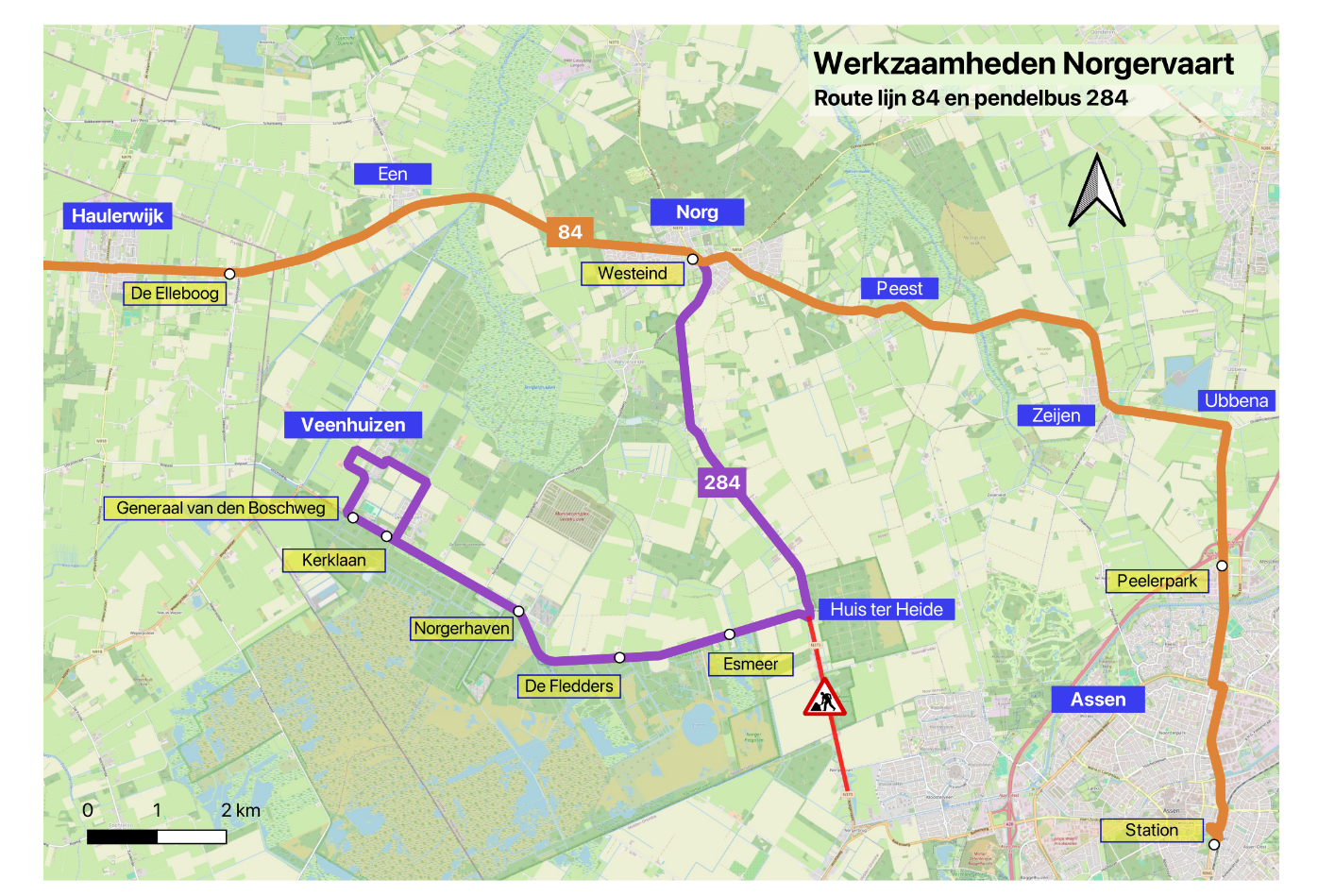 Gedurende de werkzaamheden rijdt lijn 84: vanaf Haulerwijk via Norg naar Assen. Hierdoor vervalt de rechtstreekse bediening van Veenhuizen en Kloosterveen door lijn 84. Download hier de dienstregeling tijdens de werkzaamheden.