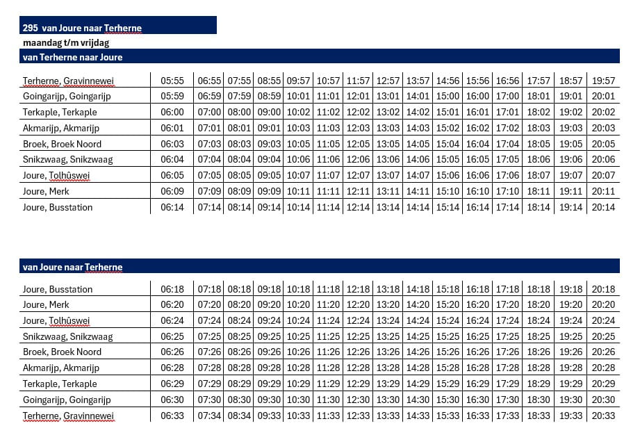 Voor reizigers uit Terherne die dit te ver vinden en reizigers uit Goingarijp, Akmarijp en Snikzwaag kunnen gebruik maken van pendelbus (8 persoons), maar houdt rekening mee dat je ongeveer 25 minuten extra reistijd hebt. De pendellijn 295 rijdt van ca. 06:00 tot 20.30 uur en sluit aan op lijn 95 en andere lijnen op het busstation in Joure. Op zaterdag kunnen bovengenoemde reizigers gebruik maken van een extra Opstapper.